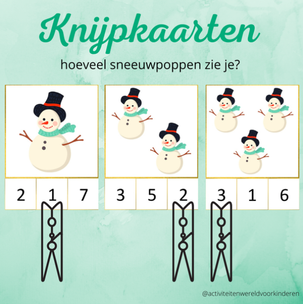 - 12 verschillende knijpkaarten met de getallen 1 t/m 12 (kleuters)