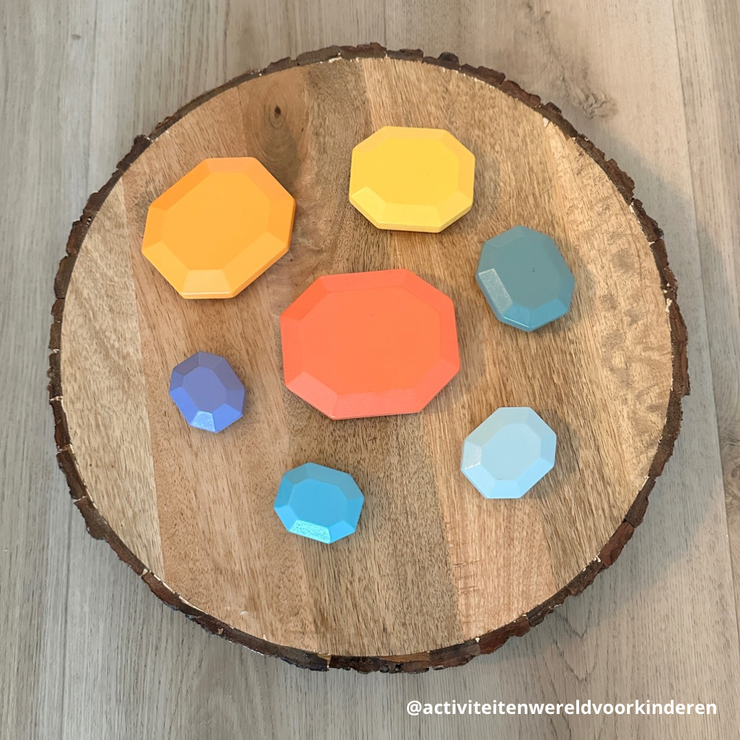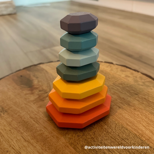 7 houten regenboog stapelstenen in verschillende kleuren.