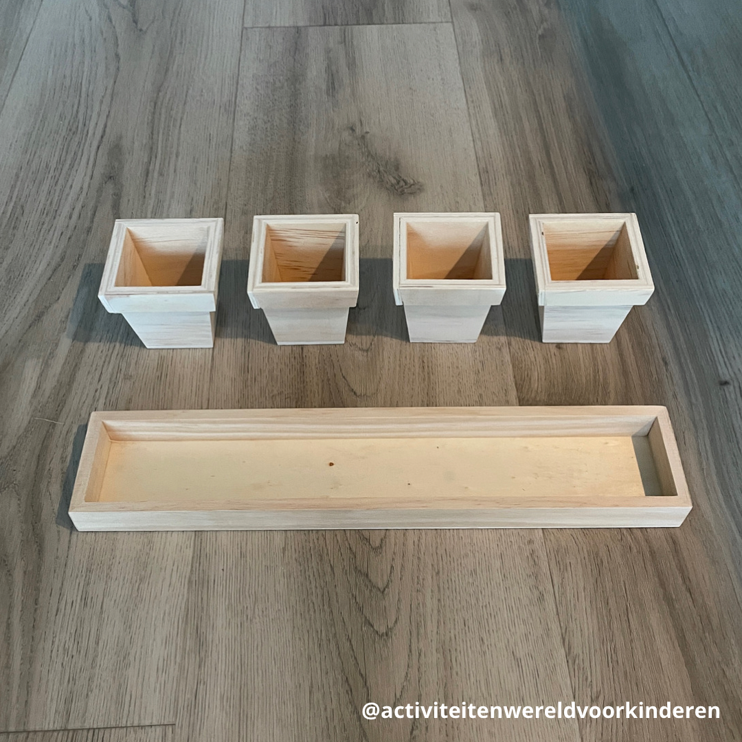 Dit leuke dienblad inclusief 4 bloempotten is ideaal te gebruiken voor een sensorische activiteit. Vul de potjes met bruine of zwarte rijst/Kikkererwten. Als leuke aanvulling kan je er ook de houten bloemen bij bestellen.